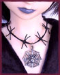 A thin leather thonging necklace done in barbed wire style, with a spider in a spiderweb pendant.